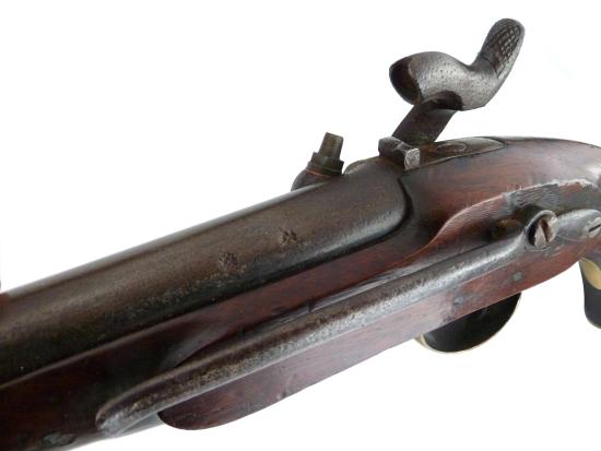 True to British officialdom, after this pistol received its commercial proofs, it underwent further government inspection and acceptance, at which point the double Crown "T.C." (Transport Corps / Transport Commisariat ?) marks were struck into the furniture, denoting their provenance.