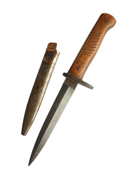 Presented in good order, this knife has an excellent blade profile, which is unsharpened, and has a good profile with only a few tiny edge nicks. The wooden grips are undamaged and the original steel scabbard is free from dents, exhibiting much age patina. Only the leather strap is lacking.