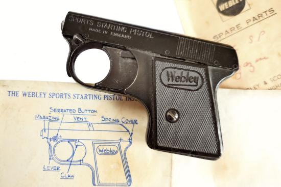 A mint and possibly unfired Webley .22 Sports Starting Pistol, complete with its original magazine, box and papers.