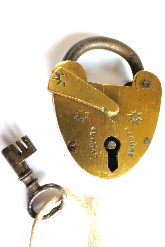 A military officer's bronze kit bag D-ring lock, complete with what is probably the original padlock and key. Related to the Boer War tent hooks, this item belonged to the same individual.