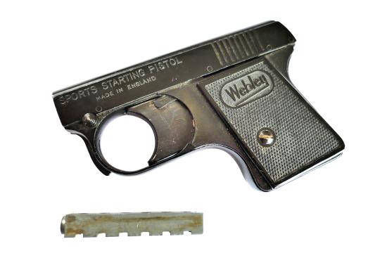 A mint and possibly unfired Webley .22 Sports Starting Pistol, complete with its original magazine, box and papers.