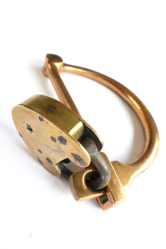 A military officer's bronze kit bag D-ring lock, complete with what is probably the original padlock and key. Related to the Boer War tent hooks, this item belonged to the same individual.