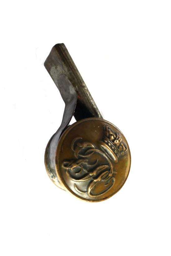 A good and original example of a General Post Office Telegram Messenger's whistle. Known to collectors as an "escargot" or "button whistle", this one is in perfect sleepy condition and loud working order. It was very likely purchased from Hudson's, the main supplier of whistles to the government.