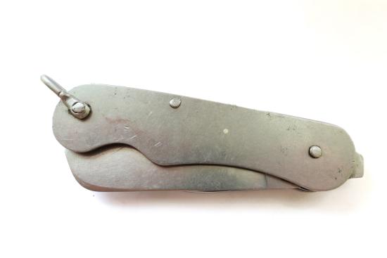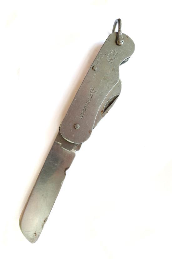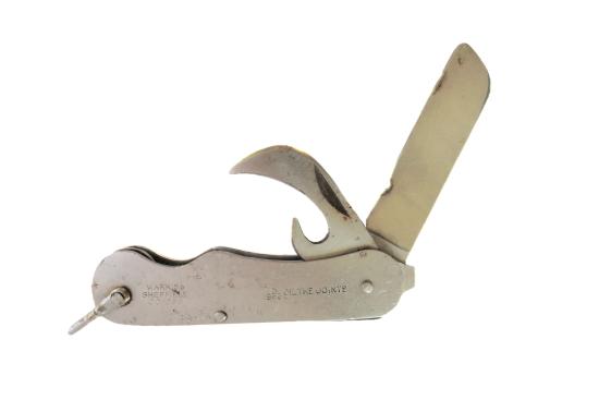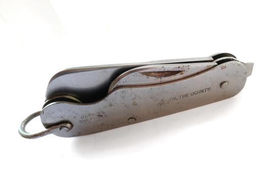 A genuine British Army issue pocket knife by Warris, dated 1953. The knife is marked with various broad arrow and military codes and remains in good working order with firm joints, but the blade does have some edge wear as shown.